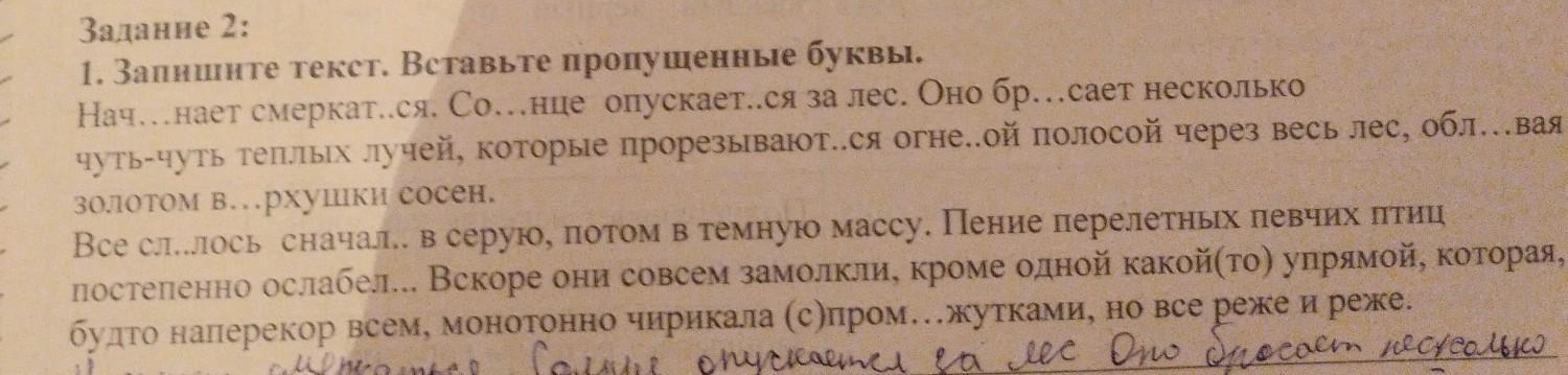 Ответ:Начинает смеркаться. Солнце опускается за лес. Оно бросает несколько чуть-чуть теплых лучей, которые прорезываются огненной полосой через весь лес, обливают золотом верхушки сосен. Все слилось сначала в серую, потом в темную массу. Пение перелетных певчих птиц постепенно ослабело. Вскоре они совсем замолкли, кроме одной какой-то упрямой, которая, будто, наперекор всем монотонно чирикала с промежутками, но все реже и реже.
