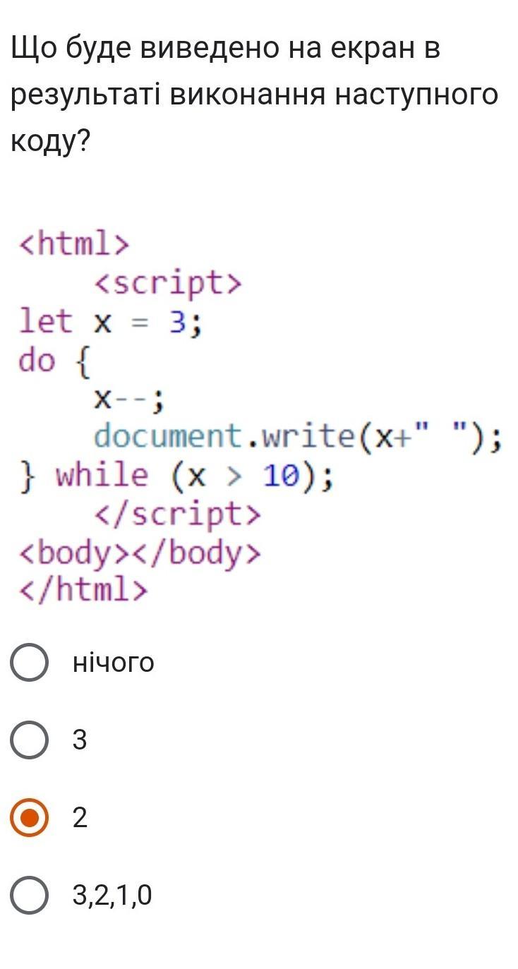 На екран не буде виведено нічого, бо умова циклу while (x > 10) вже не є правдивою на початку виконання циклу. Початкове значення x дорівнює 3, а умова циклу перевіряє, чи x більше 10. І оскільки кожного разу х буде зменшуватися на 1, то на екрані не буде нічого.