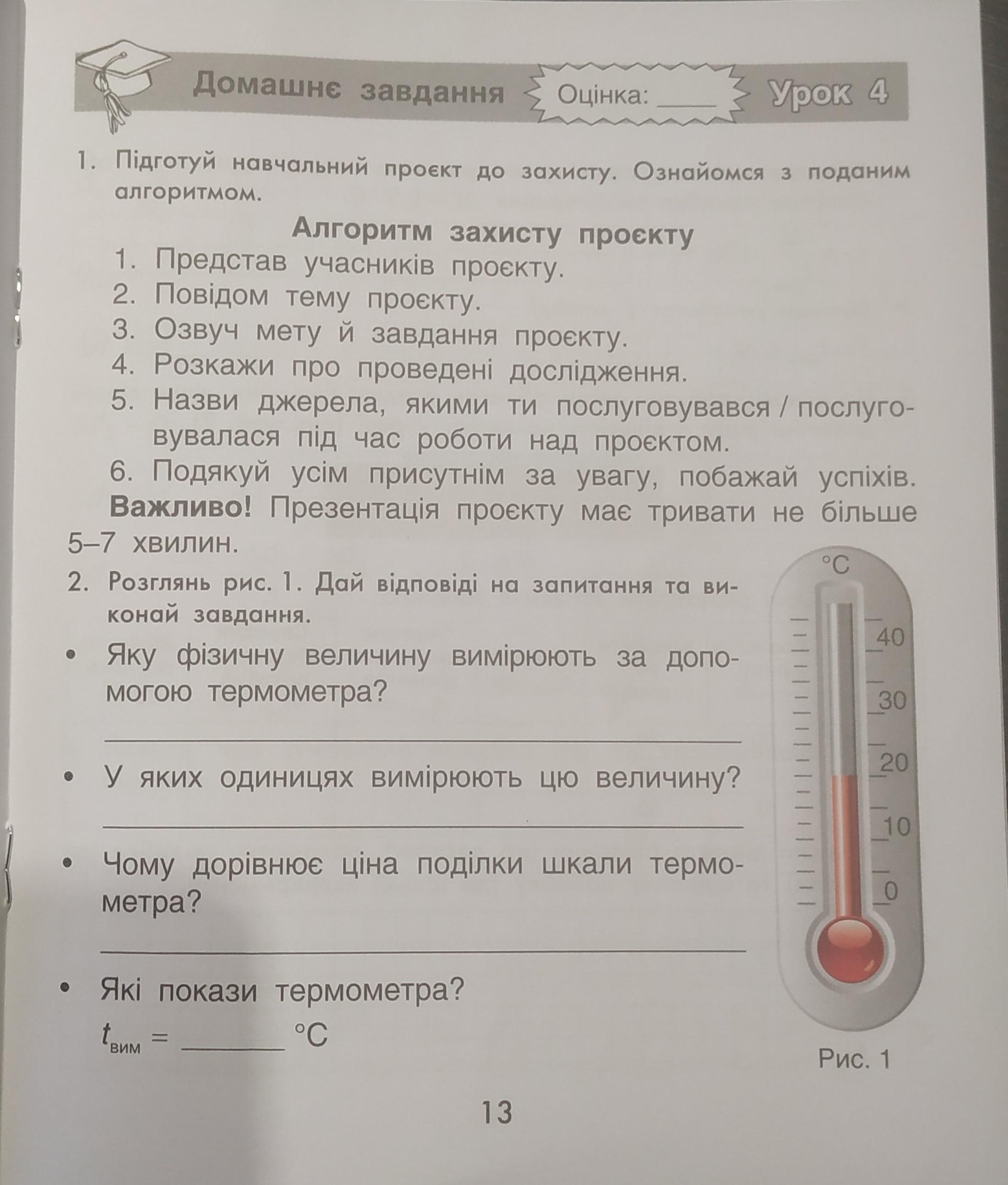 ● Мае тривати 5-7 хвилин. 2. Розглянь рис. 1. Дай відповіді на запитання та ви- конай завдання. Яку фізичну величину вимірюють за допо- могою термометра? у яких одиницях вимірюють цю величину? Чому дорівнює ціна поділки шкали термо- метра? Які покази термометра? Твим °C = 13 не більше °C 40 30 20 10 О Рис.
