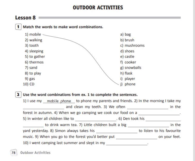 упражнение1. walking shoes, toothbrush, sleeping bag, to gather mushrooms, thermos cooker, sand castle, to play snowballs, gas flask, CD player. Упражнение2. toothbrush, to gather mushrooms, gas flask, play snowballs, thermos cooker, sand castle, CD player, walking shoes, sleeping bag.