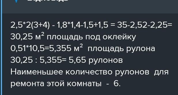 Стены комнаты с высотой потолков 2,5 м, шириной 3 м, длиной 4 м, одной дверью размерами 1 м х 2 м и одним окном 1 м × 1,5 м решили оклеить новыми обоями без рисунка. Ширина рулона 50 см, длина 10 м. Какое наименьшее количество рулонов нужно купить для ремонта этой комнаты?
