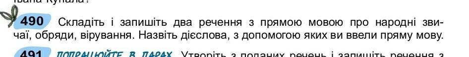 Складіть і запишіть два речення з прямою мовою про народні зви- чаї, обряди, вірування. Назвіть дієслова, з допомогою яких ви ввели пряму мову.