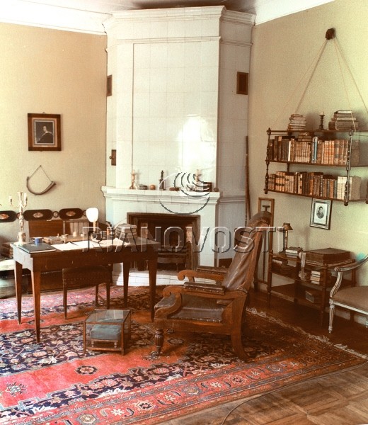 Кабинет А. С. Пушкина воссоздан по воспоминаниям современников, переписке поэта, его произведениям. Здесь находятся мемориальные вещи, связанные с памятью о поэте: стол письменный из Тригорского красного дерева конца XVIII - начала XIX вв. , кресло тверских друзей поэта, этажерка сына поэта Г. А. Пушкина, скамеечка подножная А. П. Керн, чернильница из имения Гончаровых Полотняный завод (2-ая полов. XVIII в.) , подсвечник с колпачком и щипцами (серебро, 1831г.) , подставка для перьев, трость А. С. Пушкина