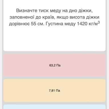 Визначте тиск меду на дно діжки, заповненої до країв, якщо висота діжки дорівнює 55 см. Густина меду 1420 кг/м3