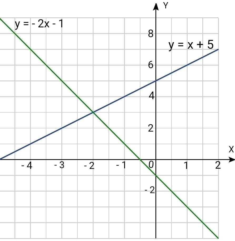 Побудуйте в одній системі координат графіки функцій у=-2х-1 та у=х+5, та знайдіть координати точки їхнього перетину.(надо и начертить)