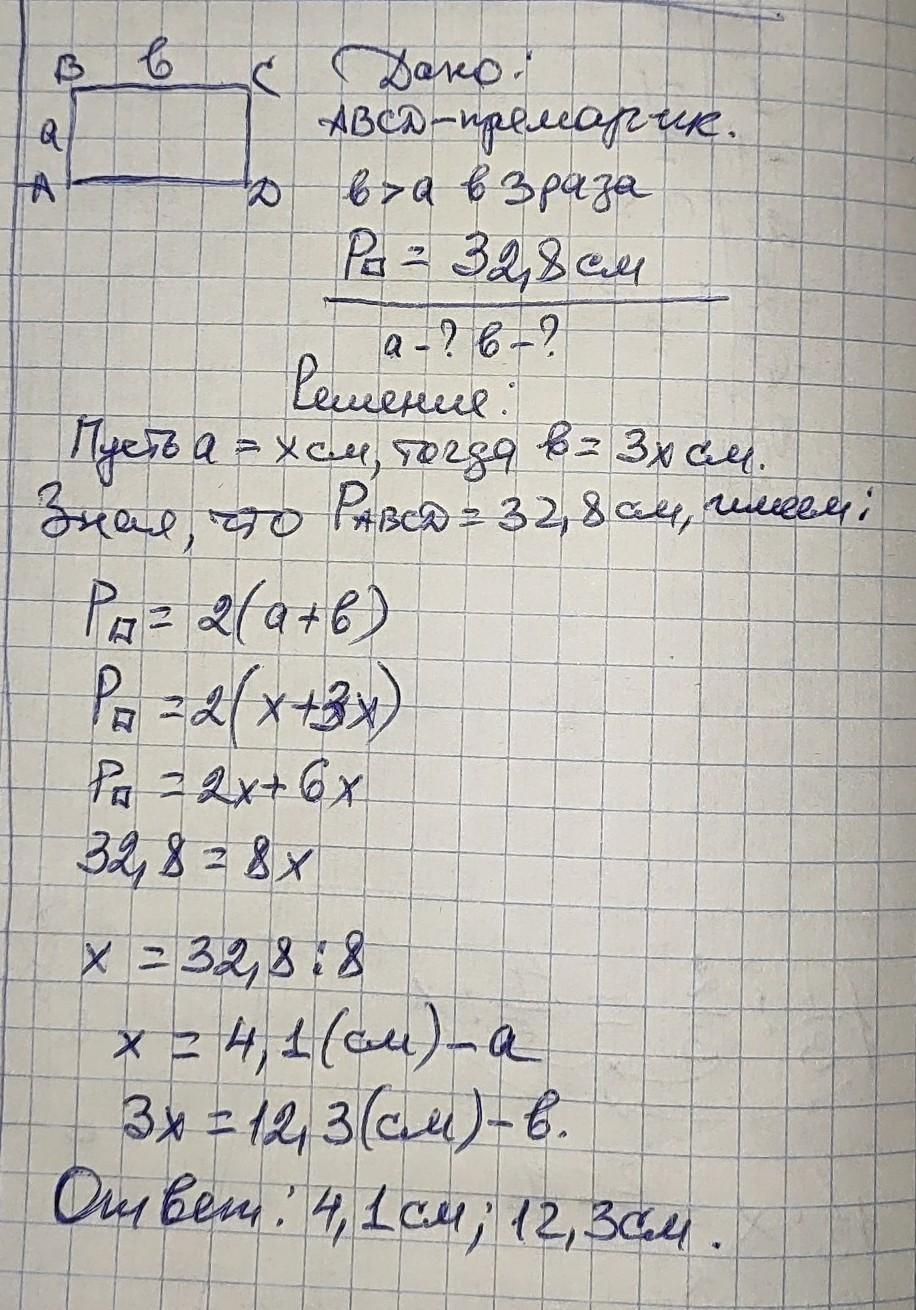 Знайти сторони прямокутника, якщо його ширина у 3 рази менша ніж довжина, а периметр 32,8 см.