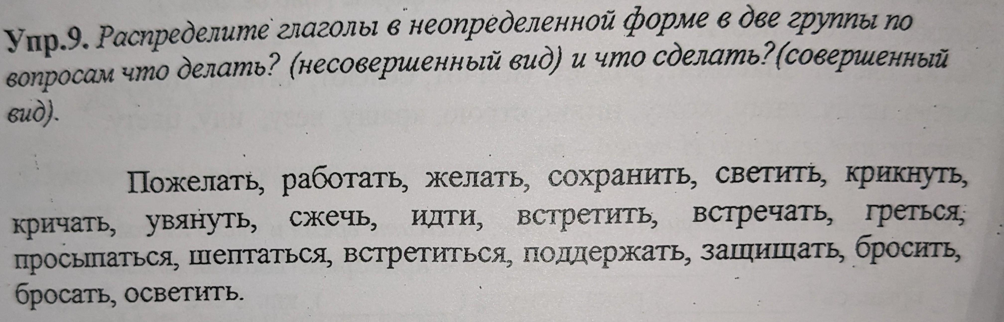 несов.вид:работать, желать,светить,кричать,идти,встречать,греться, просыпаться,шептаться, защищать, бросать.