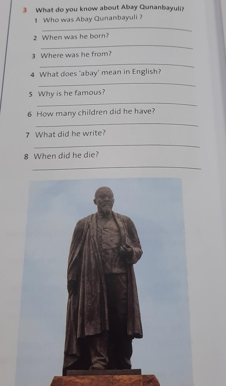 3 What do you know about Abay Qunanbayuli? 1 Who was Abay Qunanbayuli? 2 When was he born? 3 Where was he from? 4 What does 'abay' mean in English? 5 Why is he famous? 6 How many children did he have? 7 What did he write? 8 When did he die?