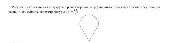 Рисунок ниже состоит из полукруга и равностороннего треугольника. Если одна сторона треугольника равна 14 см, найдите периметр фигуры.