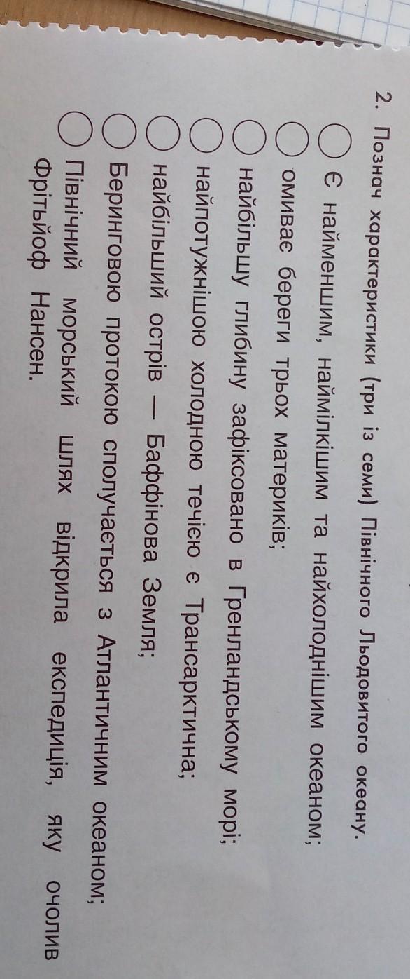2. Познач характеристики (три із семи) Північного Льодовитого океану. О Є найменшим, наймілкішим та найхолоднішим океаном; О омиває береги трьох материків; найбільшу глибину зафіксовано в Гренландському морі; О найпотужнішою холодною течією є Трансарктична; найбільший острів — Баффінова Земля; Беринговою протокою сполучається з Атлантичним океаном; О Північний морський шлях відкрила експедиція, яку Фрітьйоф Нансен. ОЧОЛИВ