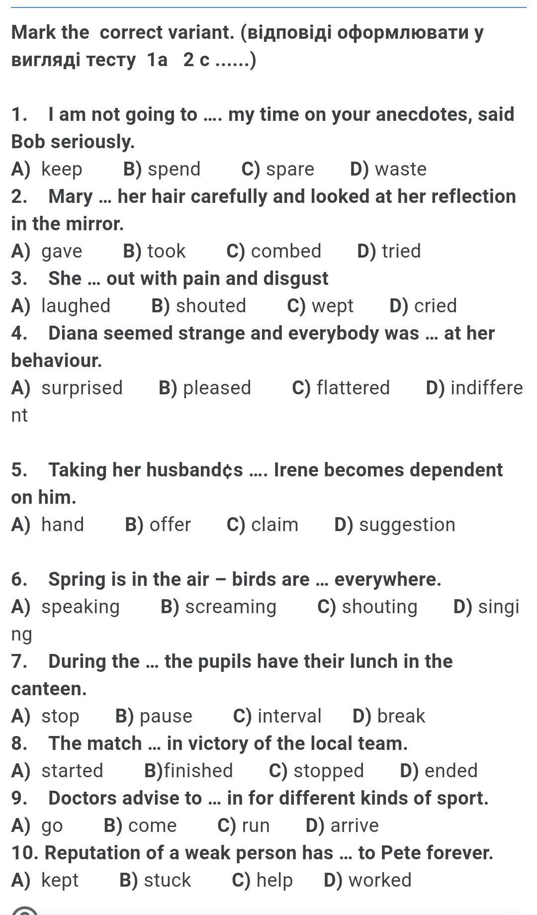 1. I am not going to... my time on your anecdotes, said Bob seriously. A) keep B) spend C) spare D) waste 2. Mary... her hair carefully and looked at her reflection in the mirror. A) gave B) took C) combed D) tried 3. She... out with pain and disgust A) laughed B) shouted C) wept D) cried 4. Diana seemed strange and everybody was... at her behaviour. A) surprised nt B) pleased C) flattered D) indiffere 5. Taking her husbandęs.... Irene becomes dependent on him. A) hand B) offer C) claim D) suggestion 6. Spring is in the air - birds are... everywhere. A) speaking B) screaming C) shouting ng D) singi 7. During the ... the pupils have their lunch in the canteen. C) interval D) break 8. The match ... in victory of the local team. A) stop B) pause A) started B)finished C) stopped D) ended 9. Doctors advise to... in for different kinds of sport. A) go B) come C) run D) arrive 10. Reputation of a weak person has... to Pete forever. A) kept B) stuck C) help D) worked