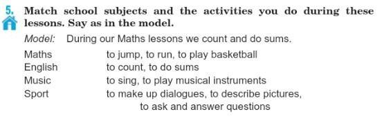 5. Match school subjects and the activities you do during these lessons. Say as in the model. Model: During our Maths lessons we count and do sums. Maths to jump, to run, to play basketball to count, to do sums English Music Sport to sing, to play musical instruments to make up dialogues, to describe pictures, to ask and answer questions