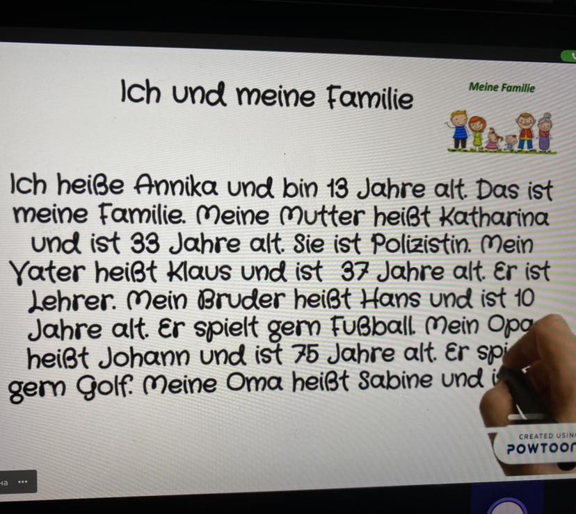 если да то вот: Ich heiße (имя) und ich bin (возраст) jahre alt. Das ist meine Familie. Meine Mutter heißt (имя) und ist (возраст) Jahre alt. Sie ist (кем она работает). Meine Vater heißt (имя) und ist (возраст) Jahre alt. Er ist (место работы отца). Далее если есть братья или сестры: Mein Bruder heißt (имя) und ist (возраст) Jahre alt. ( что он любит делать, допустим играть в футбол ) Er spielt gern Fußball ( с сестрой точно так же, но меняем Bruder на Schwester )