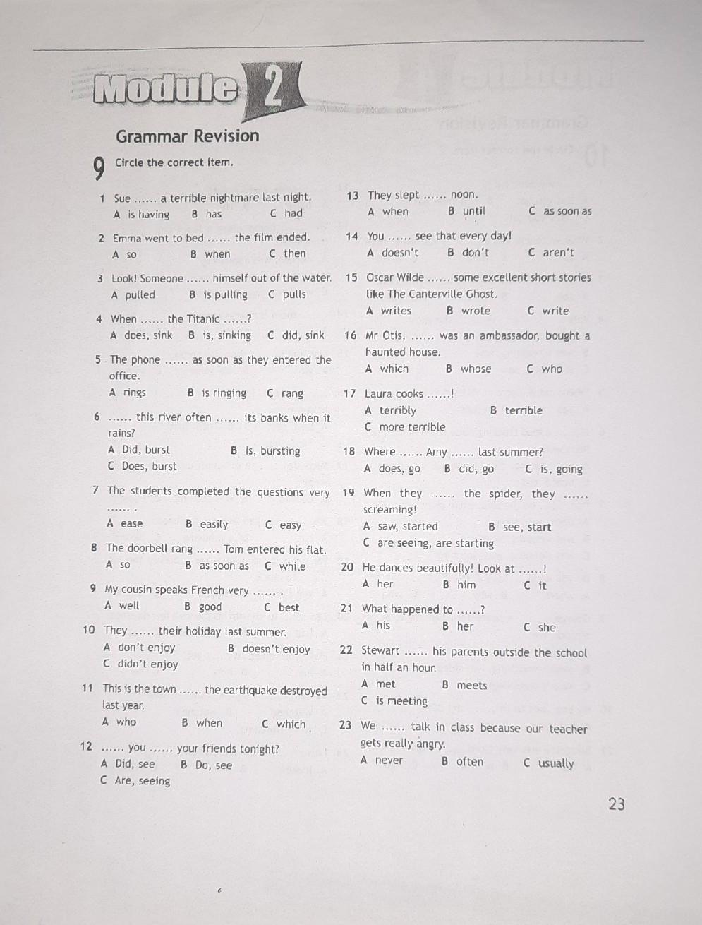 Module 2 Grammar Revision Circle the correct item. 1 Sue...... a terrible nightmare last night. A is having B has C had 2 Emma went to bed ...... the film ended. A so B when C then 3 Look! Someone ...... himself out of the water. A pulled B is pulling C pulls 5 The phone...... as soon as they entered the office. A rings B is ringing C rang . this river often ...... its banks when it rains? A Did, burst C Does, burst **** 4 When ...... the Titanic ......? A does, sink B is, sinking C did, sink 16 Mr Otis, ...... was an ambassador, bought a haunted house. A which ***** 12 B easily C easy 8 The doorbell rang ...... Tom entered his flat. A so B as soon as C while A ease 9 My cousin speaks French very A well B good C best 10 They...... their holiday last summer. A don't enjoy C didn't enjoy B Is, bursting 11 This is the town...... the earthquake destroyed last year. A who you. A Did, see C Are, seeing ****** ****** B when 7 The students completed the questions very 19 When they ... the spider, they screaming! A saw, started C are seeing, are starting B doesn't enjoy 13 They slept ...... noon. A when B until C which 14 You...... see that every day! A doesn't B don't your friends tonight? B Do, see 15 Oscar Wilde...... some excellent short stories like The Canterville Ghost. A writes B wrote B whose 17 Laura cooks ......! A terribly C more terrible C as soon as 20 C aren't C write 21 What happened to ......? A his B her 18 Where ...... Amy...... last summer? A does, go B did, go C is, going C who B terrible B meets B see, start He dances beautifully! Look at .......! A her B him Cit G***** C she 22 Stewart ...... his parents outside the school in half an hour. A met C is meeting 23 We...... talk in class because our teacher gets really angry. A never B often C usually 23 срочнооо