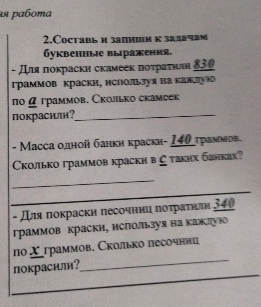Составь и запиши их задачам буквенное выражения для окраски скамеек покрасили 830 г краски используя на каждую параграф сколько скамеек покрасили масса одной банки краски 140 г Сколько граммов краски с таких банках для покраски песочно потратили 340 г краски использовано каждое по X г Сколько песочник покрасили?