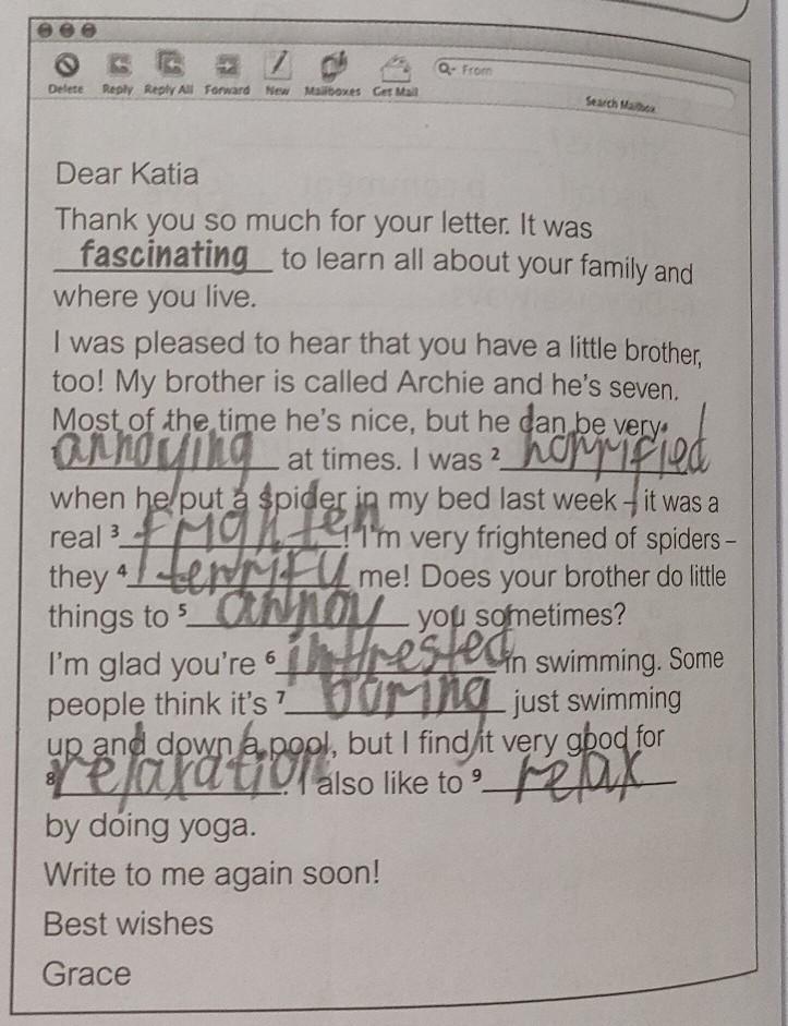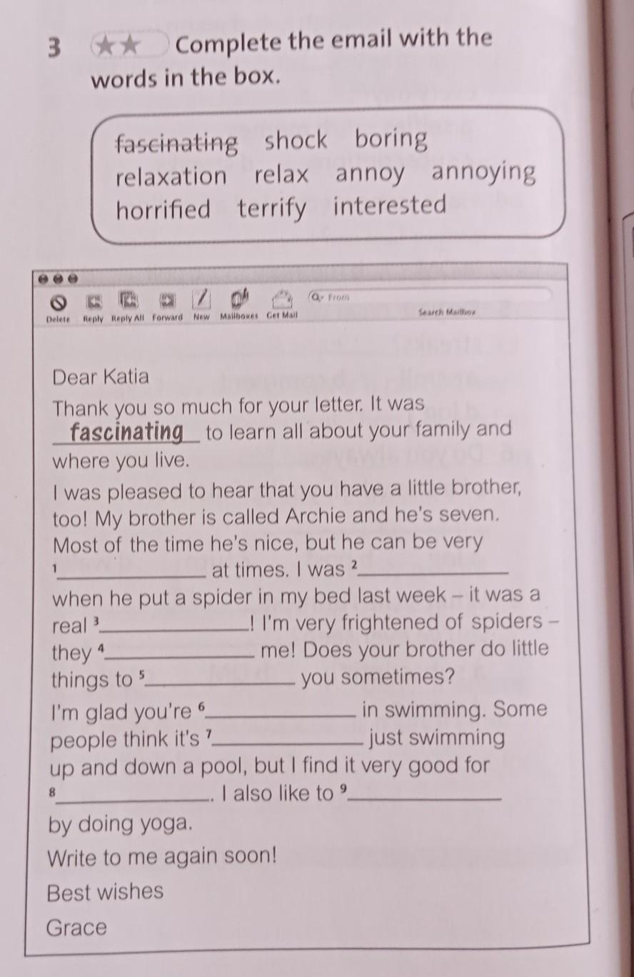 Complete the email with the words in the box. fascinating shock boring relaxation relax annoy relax annoy annoying horrified terrify interested.