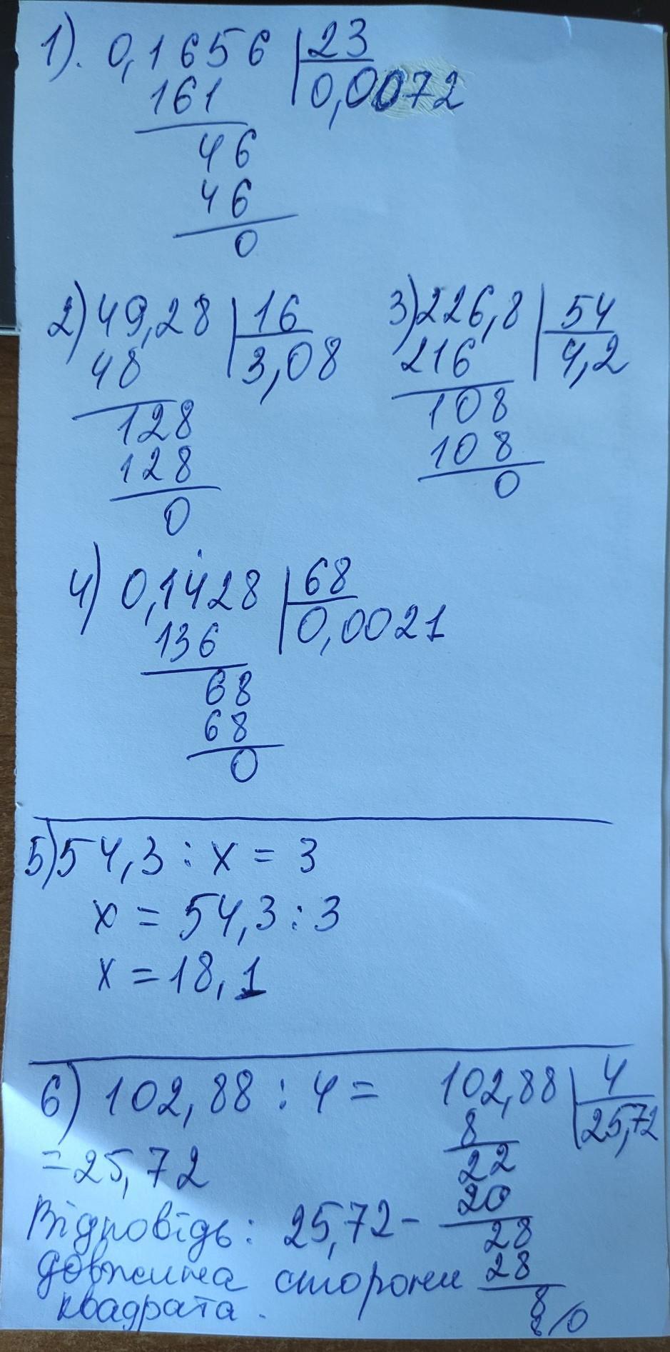 Розв'язати в стовпчик.1) 0,1656 : 23; 2) 49,28 : 16; 3) 226,8 : 54; 4) 0,1428 : 68;