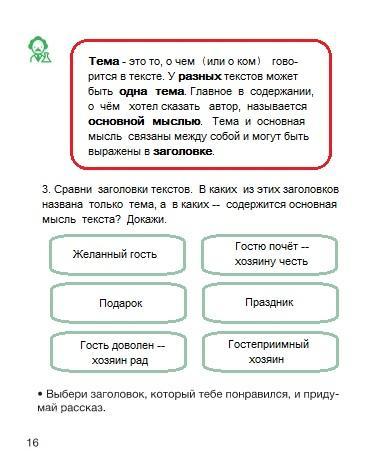3. Сравни заголовки текстов. В каких из этих заголовков названа только тема. а в каких- содержится и основная мысль текста? Докажи. Желанный гость Гостю почёт-хозяину честь Праздник Гостеприимный хозяин Подарок Гость доволен хозяин рад Выбери заголовок, который тебе понравился, и придумай рассказ. помогите пж дам 100 балов 3 класс русский язык