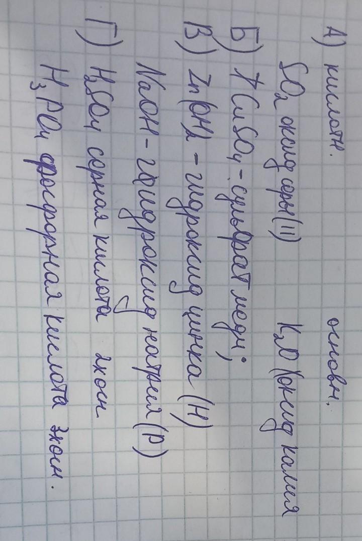 1. Из перечня веществ Zn(OH)2, HCl, SO2, H2SO4, CuSO4, NaOH, H3PO4, K2O А) Выписать оксиды, разделить на основные и кислотные. Дать им названия. Б) Выписать соли, дать им названия. В) Выписать основания, дать им названия, разделить на растворимые и нерастворимые. Г) Выписать кислоты, дать им названия, разделить на одно,-двух, и трехосновные. Оксиды Соли Основания основные кислотные Кислоты растворимые нерастворимые Одноосн. Двухосн. Трехосн. [8