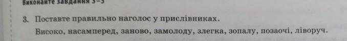 3. Поставте правильно наголос у прислівниках. Високо, насамперед, заново, замолоду, злегка, зопалу, позаочі, ліворуч.