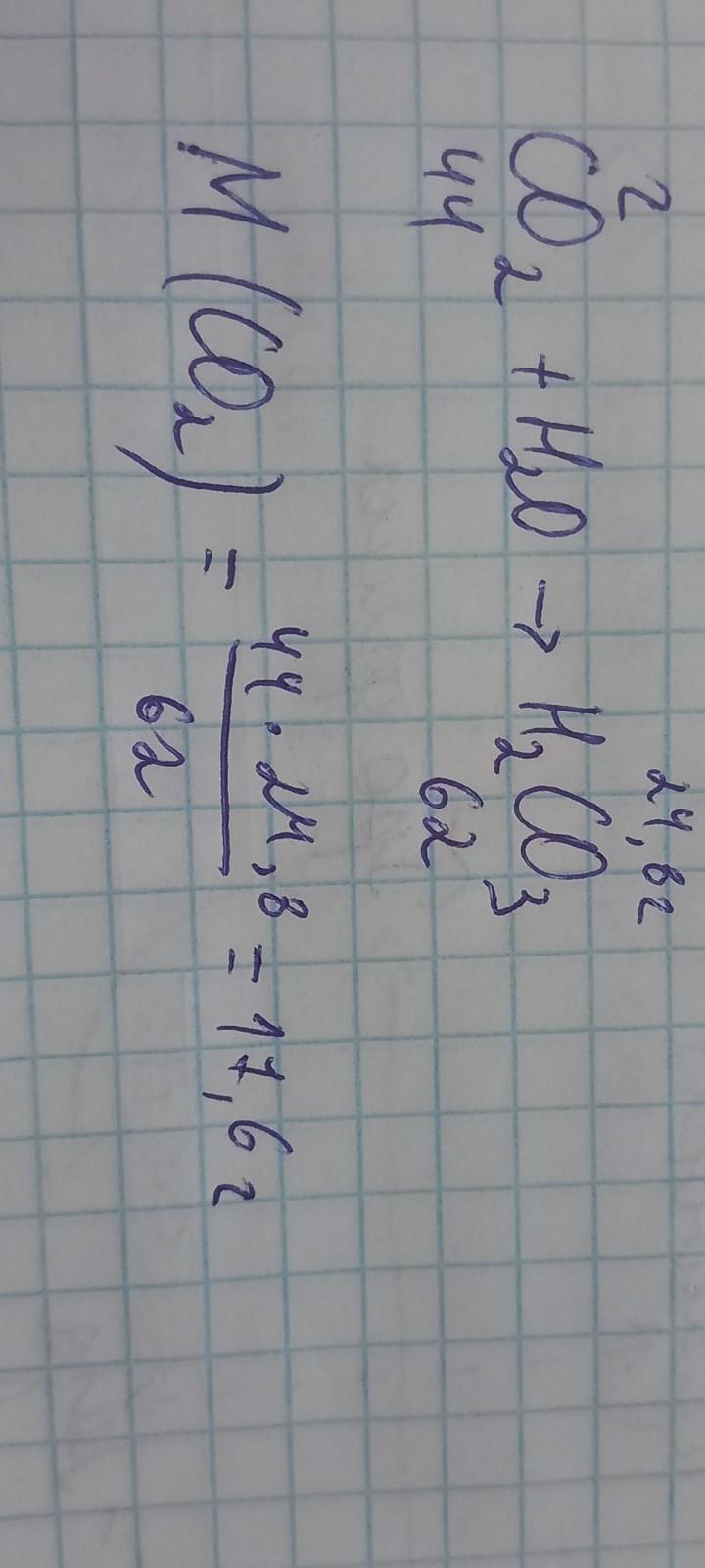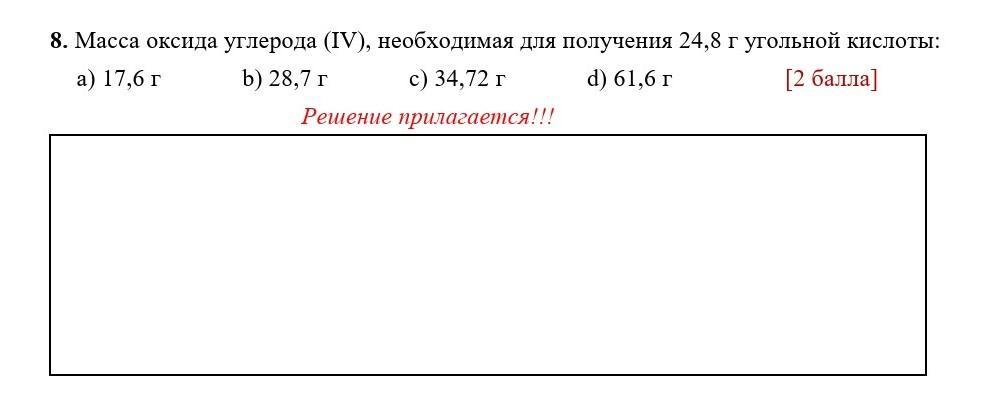 8. Масса оксида углерода (IV), необходимая для получения 24,8 г угольной кислоты: а) 17,6 г c) 34,72 г d) 61,6 г [2 балла] ь) 28,7 г Решение прилагается!!!