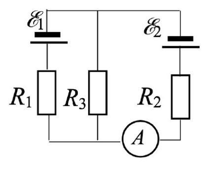 Два источника тока с ЭДС E1 = 110 В и E2 = 220 В и три резистора с сопротивлениями R1 = 100 Ом, R2 = 100 Ом и R3 = 500 Ом соединены так как показано на рисунке. Определить силы токов в трех резисторах. Внутренним сопротивлением источников питания пренебречь. (Решить данную задачу правилом Кирхгофа)