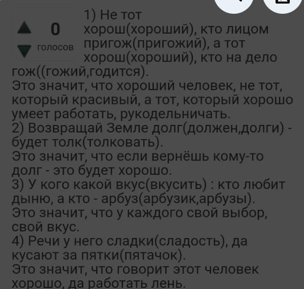 9. Прочитай пословицы и объясни, как ты их понимаешь. Докажи, что выделенные буквы в конце и середине слов написаны правильно. Какое правило для этого нужно вспомнить? Не тот хорош, кто лицом пригож, а тот хорош, кто на дело гож. Возвращай земле долг - будет толк. У кого какой вкус: кто любит дыню, а кто - арбуз¹. Речи у него сладки, - да кусают за пятки. • Спиши пословицы. В скобках запиши проверочные слова.