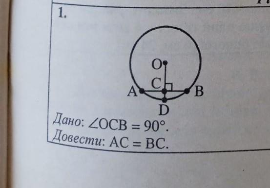 Объяснение: Зєднаємо точки О і А, а також точки О і В, ОА=ОВ= радиусу намальованого кола. РОзглянемо фігуру АОВ. Це - трикутник, прчому рівнобедрений, бо ОА=ОВ= радиусу кола. За умовою кут ОСВ =90 градусів, інакше кажучи, це означає, що ОС перпендикулярна АВ. Таким чином, в трикутнику АОВ мі бачимо висоту ОС, проведену до основи АВ нашого рівнобедреного трикутника. За властивістю висоти рівнобедреного трикутника, проведеної до основи, висота ділить основу навпіл, тобто АС=ВС, зщо й треба було довести.