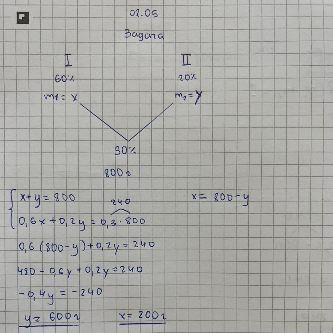 Скільки грамів 60% і скільки грамів 20% розчину солі треба взяти, щоб отримати 800 грамів 30% розчину солі?