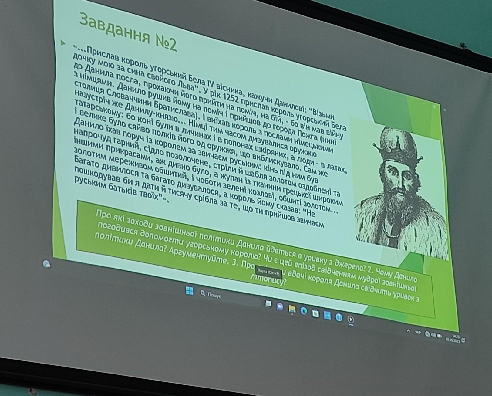 1. Уривок з джерела описує заходи зовнішньої політики Данила, коли він отримав прохання короля Бели IV про прийняття його дочки за дружину свого сина Лева та про допомогу військом у боротьбі з німецькими завойовниками.