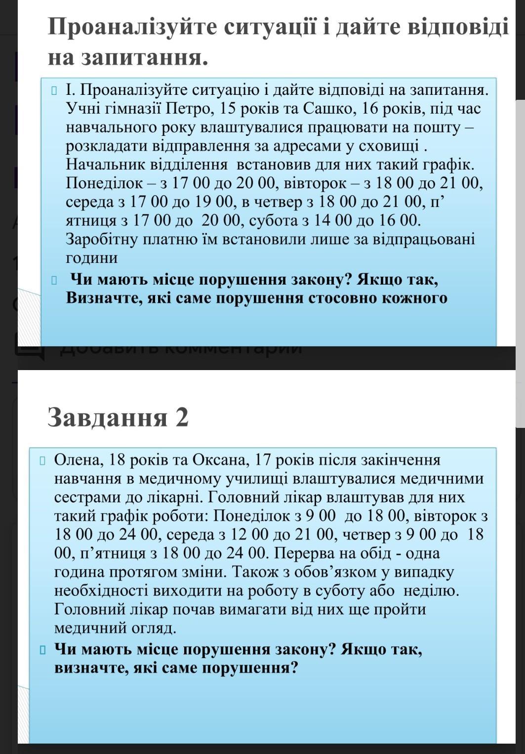 2.Якщо так, визначте, які саме порушення стосовно кожного - Порушення стосуються праці підлітків. Згідно з законодавством України "Про працю дітей", діти молодше 16 років не можуть бути зайняті на роботі, а діти віком від 16 до 18 років можуть бути зайняті лише на легких роботах та не більше 24 годин на тиждень. Таким чином, працю підлітків на пошті відповідає вимогам закону лише щодо годин роботи в п'ятницю та суботу, а робота в інші дні тижня є порушенням закону.