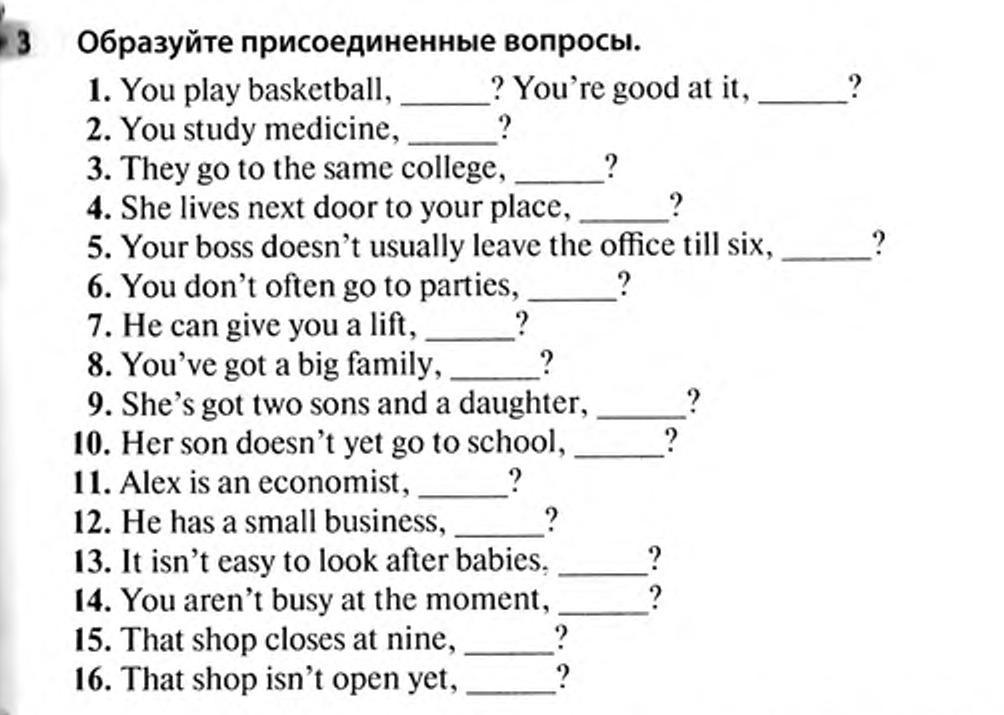 1) don't you, aren't you 2) don't you 3) don't they 4) doesn't she 5) does he 6) do you 7) can't he 8) haven't you 9) hasn't she 10) does he 11) isn't he 12) doesn't he 13) is it 14) are you 15) doesn't it 16) is it.