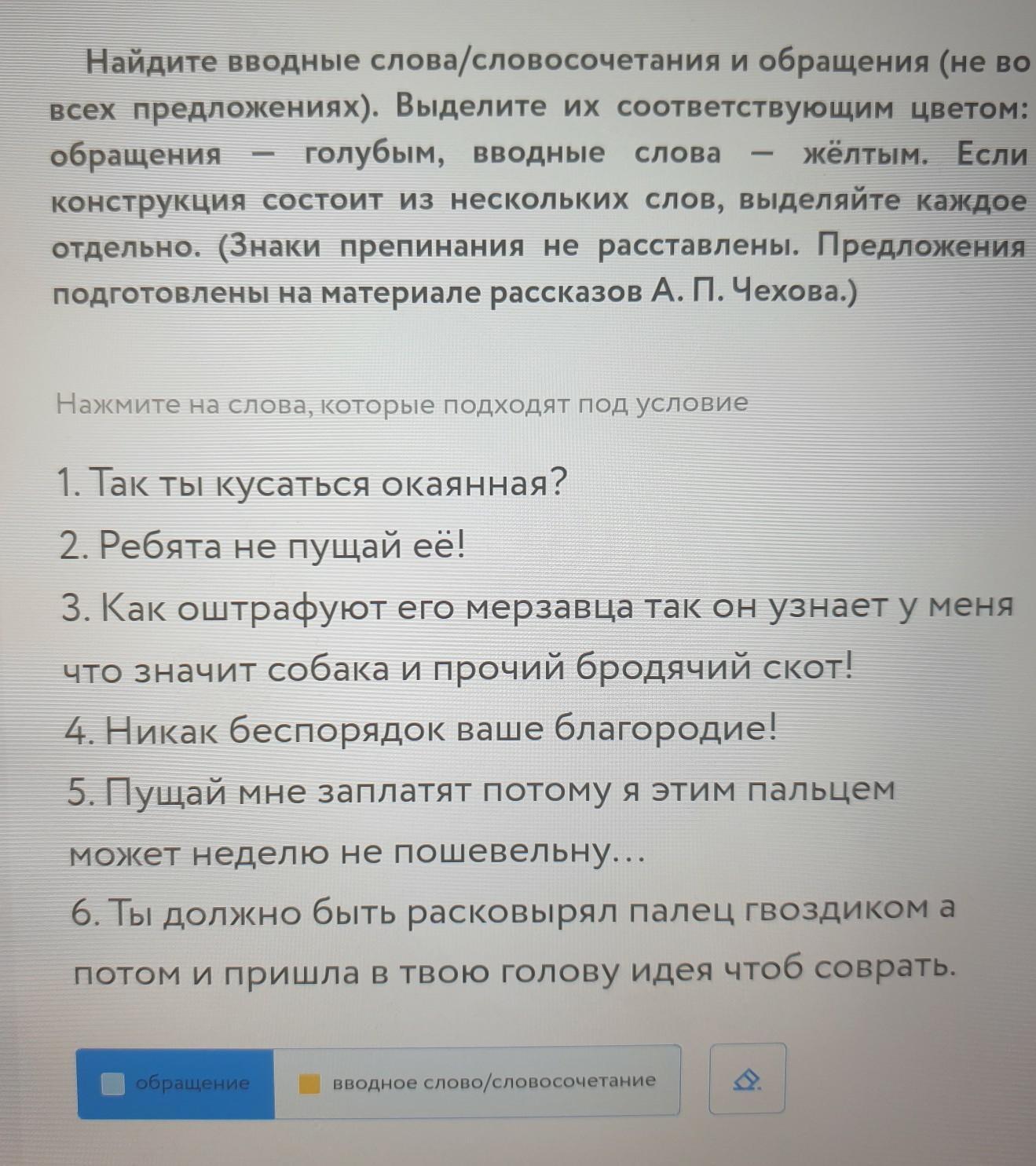 Найдите вводные слова/словосочетания и обращения (не во всех предложениях). Выделите их соответствующим цветом: обращения голубым, вводные слова жёлтым. Если конструкция состоит из нескольких слов, выделяйте каждое отдельно. (Знаки препинания не расставлены. Предложения подготовлены на материале рассказов А. П. Чехова.) Нажмите на слова, которые подходят под условие