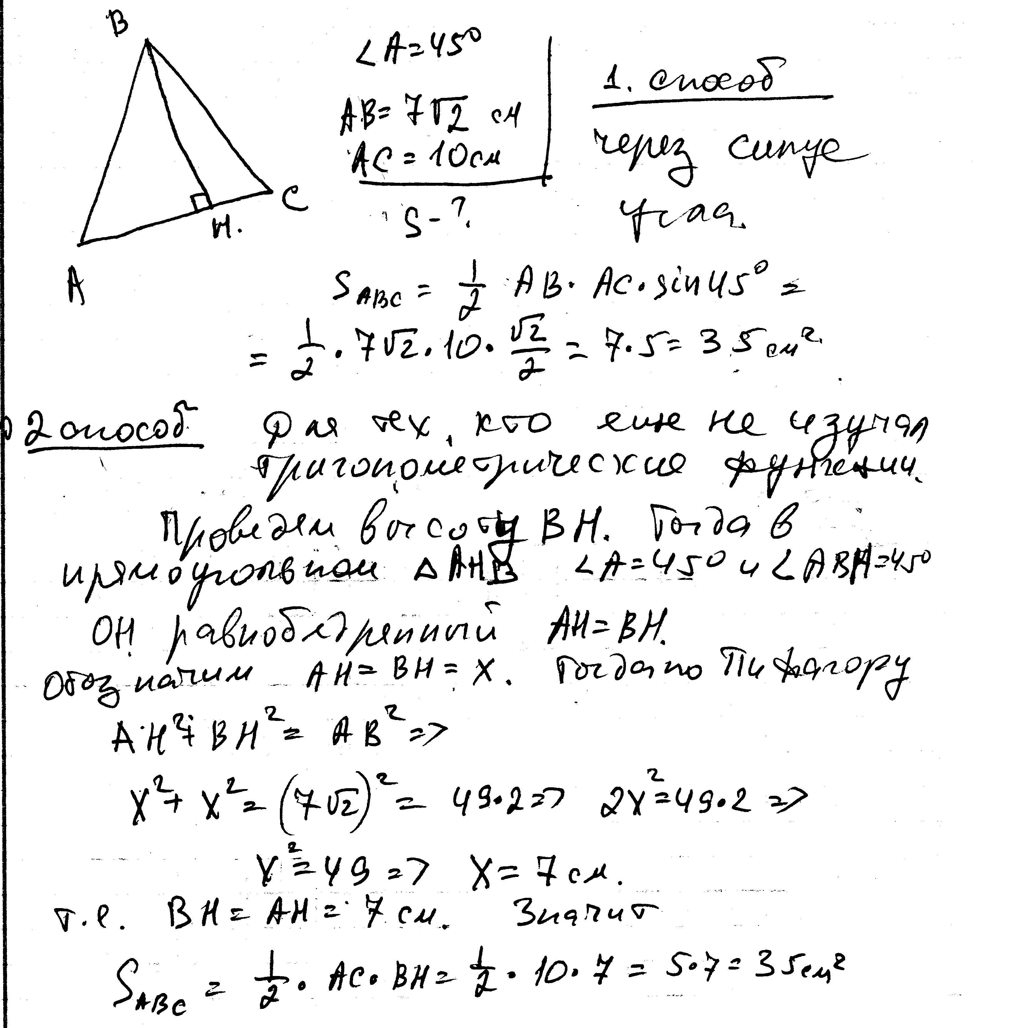 две стороны треугольника равны 7квадратный корень из 2 см и 10 см,а угол между ними равен 45 градусов.Найдите площадь треугольника