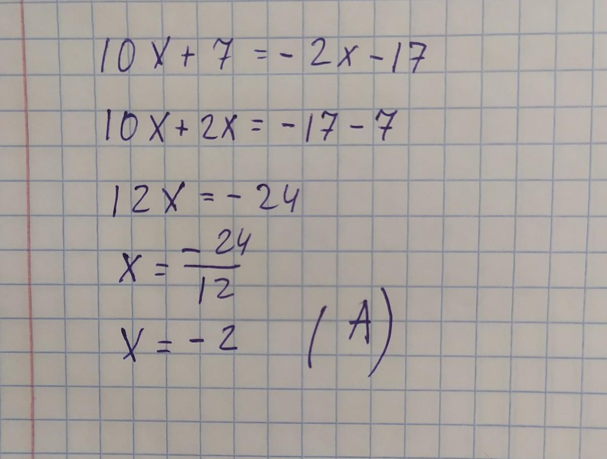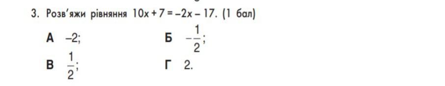 3. Розв'яжи рiвняння 10x + 7 = -2x - 17. (1 бал) 1 Б --: 2 A -2; B N 1 2 Г 2.