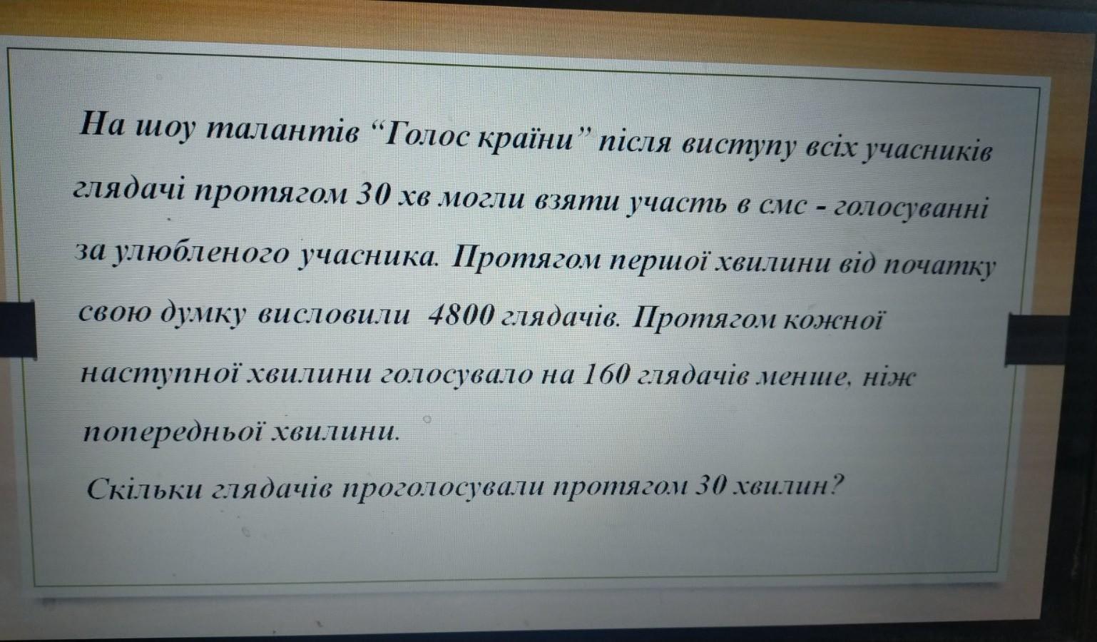 За умовою, на початку голосування свою думку висловили 4800 глядачів. Далі кожну наступну хвилину голосувало на 160 глядачів менше, ніж попередньої.