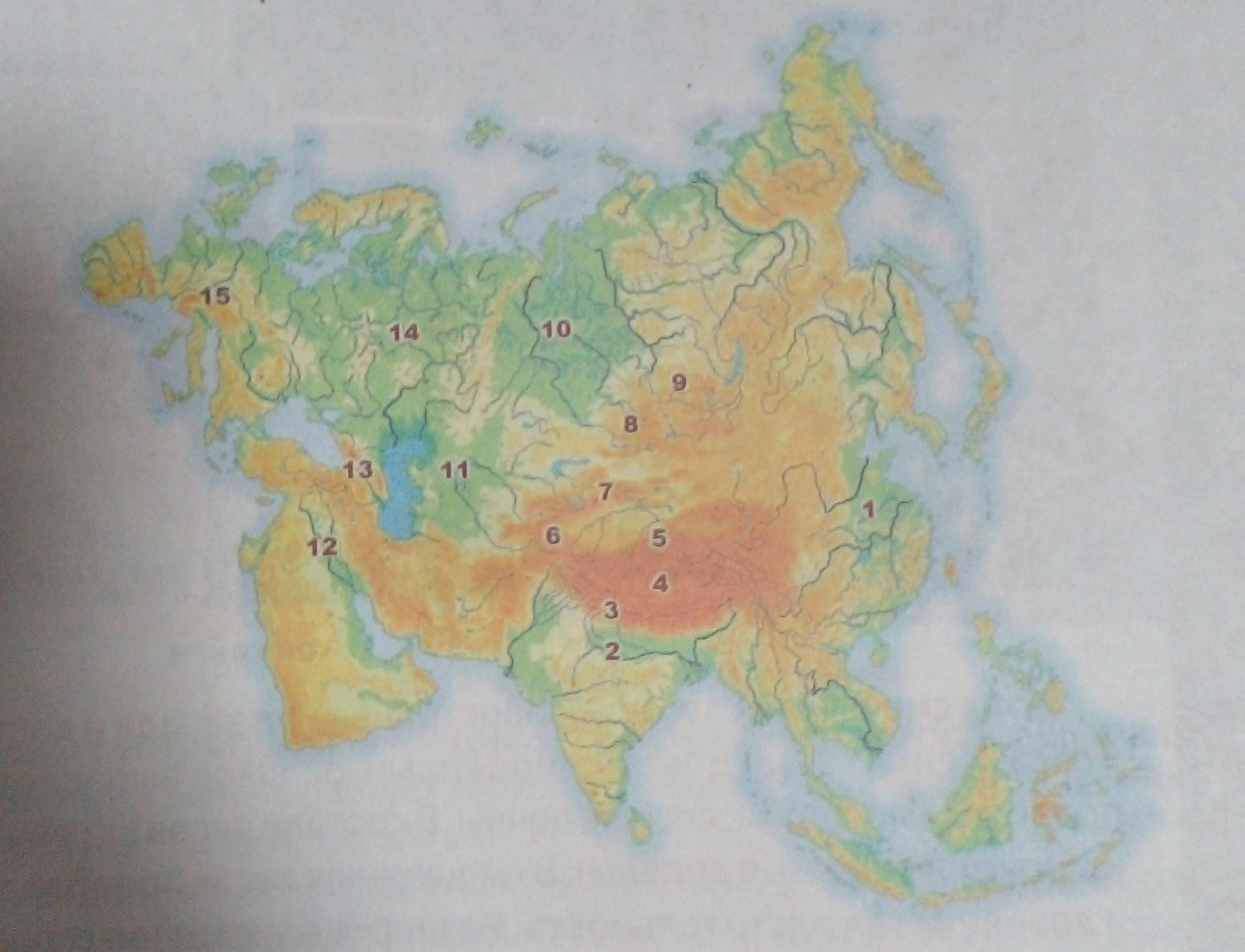 3. Какие формы рельефа показаны ниже цифрами? Среди них определите самые близ- корасположенные к экватору, начальному меридиану, к северному полюсу. Какой цифрой обозначена дугообразная горная система?