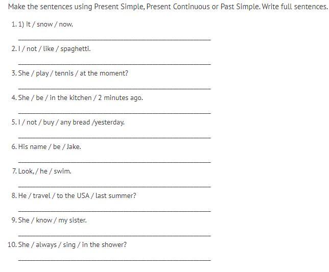 Make the sentences using Present Simple, Present Continuous or Past Simple. Write full sentences.