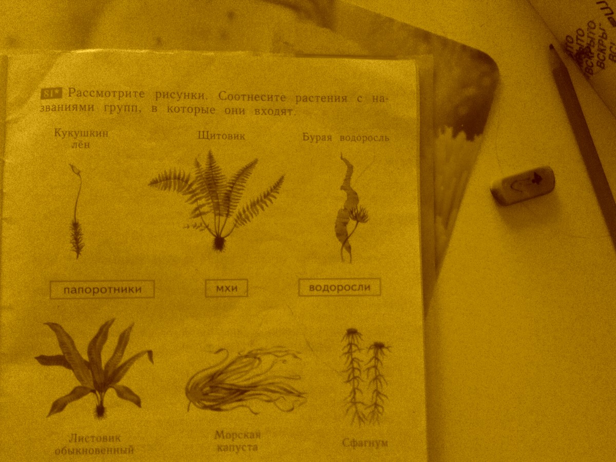 кукушкин лён-мох, щитовик-папоротник. бурая водоросли-водоросли. листовик обыкновенной-папоротники. морская капуста-водоросли. сфагнум-мох