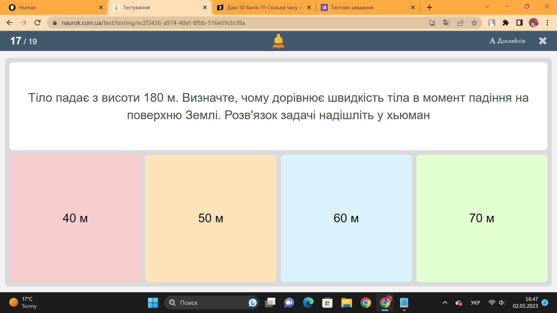 Отже, швидкість тіла в момент падіння на поверхню землі приблизно дорівнює 60м/с.