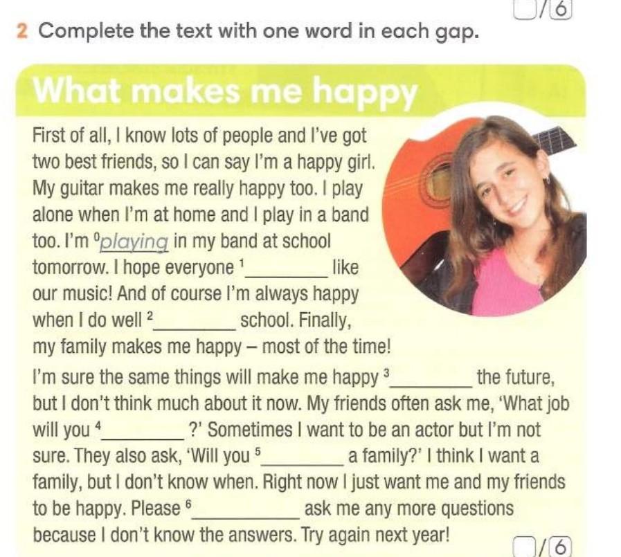 What makes me happy First of all, I know lots of people and I've got two best friends, so I can say I'm a happy girl. My guitar makes me really happy too. I play alone when I'm at home and I play in a band too. I'm playing in my band at school tomorrow. I hope everyone 1... like our music! And of course I'm always happy when I do well 2... school. Finally, my family makes me happy - most of the time! I'm sure the same things will make me happy 3... the future, but I don't think much about it now. My friends often ask me, 'What job ?' Sometimes I want to be an actor but I'm not sure. They also ask, 'Will you 5... a family?' I think I want a family, but I don't know when. Right now I just want me and my friends to be happy. Please 6... ask me any more questions because I don't know the answers. Try again next year! 35 балов
