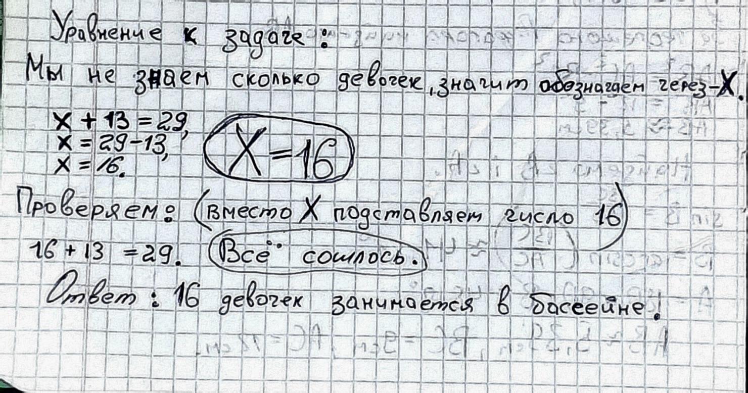 1. Составь уравнение к условию задачи. Реши уравнения. - В плавательном бассейне занимаются девочки и 13 мальчиков. Всего в бассейне 29 детей. Сколько девочек занимается в бассейне? +++