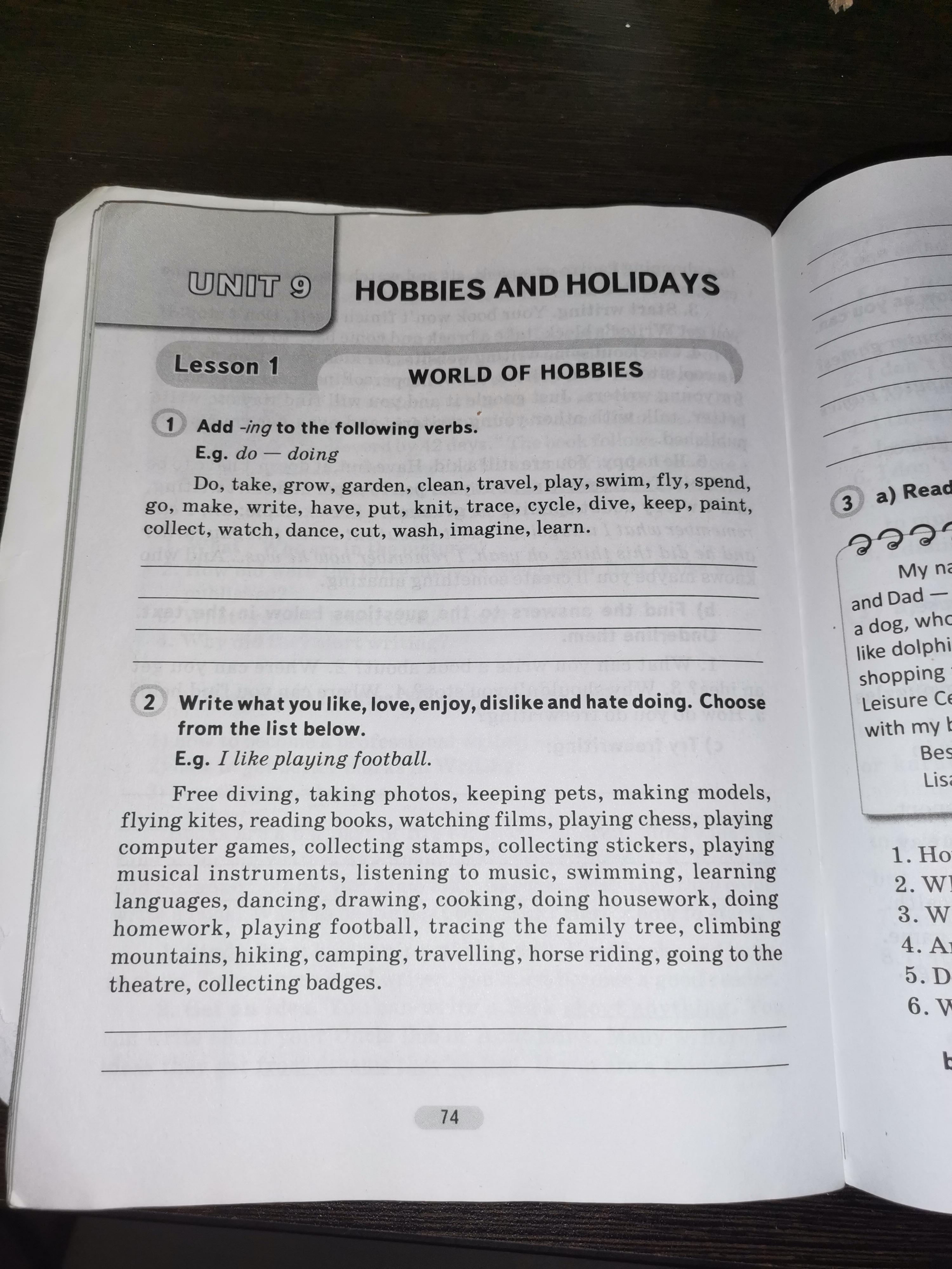 doing, taking, growing, gardening, cleaning, traveling, plaing, swiming, flying, spending, going, making, writing, having, puting, kniting, tracing, cycling, diving, keeping, painting, collecting, watching, dancing, cuting, washing, imagining, learning