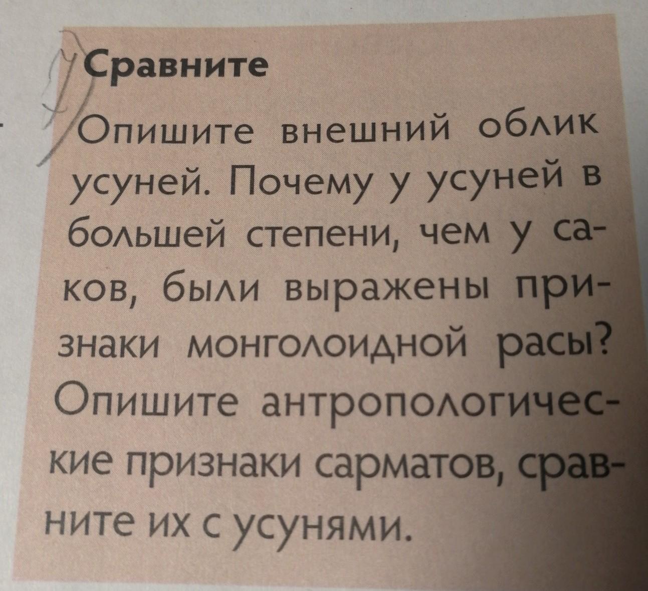 Сравните Опишите внешний облик усуней. Почему у усуней в большей степени, чем у са- ков, были выражены при- знаки монголоидной расы? Опишите антропологичес- кие признаки сарматов, срав- ните их с усунями.