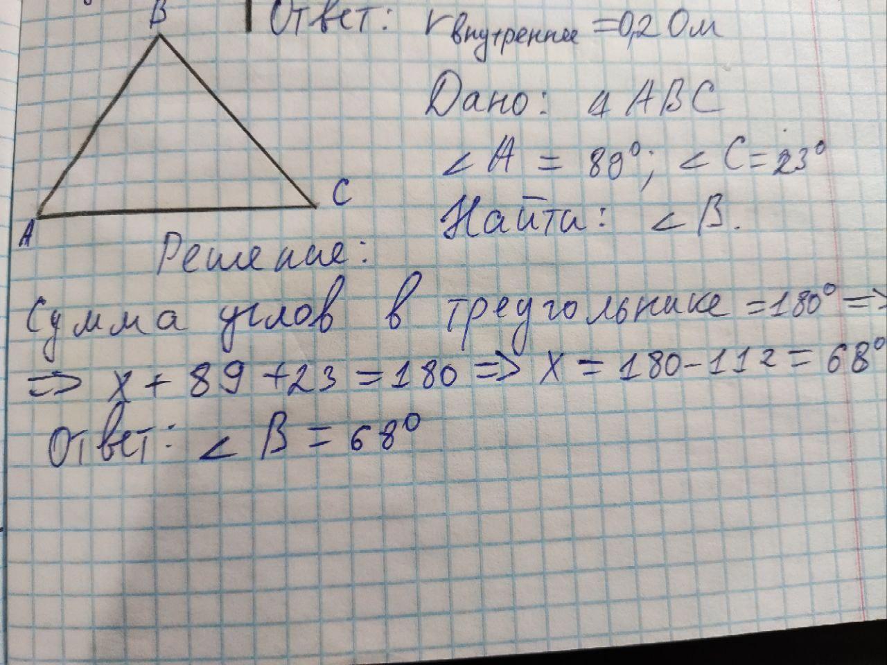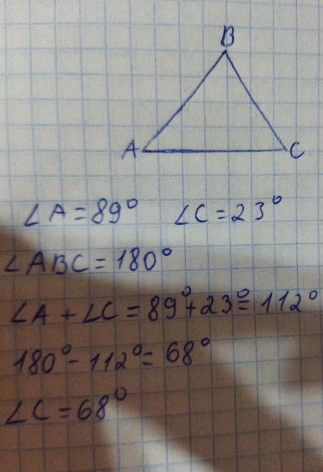 В треугольнике ABC: ∠A = 89(градуса), ∠C = 23(градуса),
