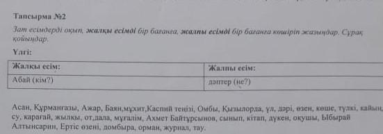 Зат есімдерді оқып, жалқы есiмдi бiр баганга, жалпы есiмдi бiр баганга кошiрiп жазындар. Сұрақ койындар. Улгi: Жалкы есiм: Абай (кім?) Жалпы есiм: даптер (не?) Асан, Курмангазы, Ажар, Баян,мухит,Каспий теніз, Омбы, Қызылорда, ул, дэрi, озен, кеше, тулкi, су, карагай, жылкы, от,дала, мугалiм, Ахмет Байтұрсынов, сынып, кiтап, дукен, окушы, Ыбырай Алтынсарин, Ертіс өзені, домбыра, орман, журнал, тауо.