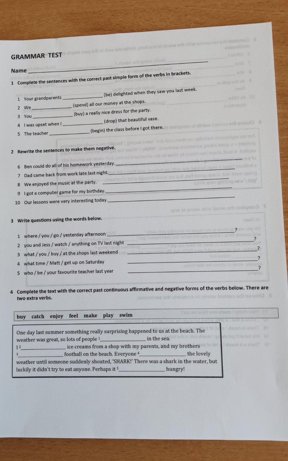 One day last summer something really surprising happened to us at the beach. The weather was great, so lots of people were swimming in the sea. I was buying ice creams from a shop with my parents, and my brothers were playing football on the beach. Everyone was enjoying the lovely weather until someone suddenly shouted, ‘SHARK!’ There was a shark in the water, but luckily it wasn't trying to eat anyone. Perhaps it was feeling hungry!