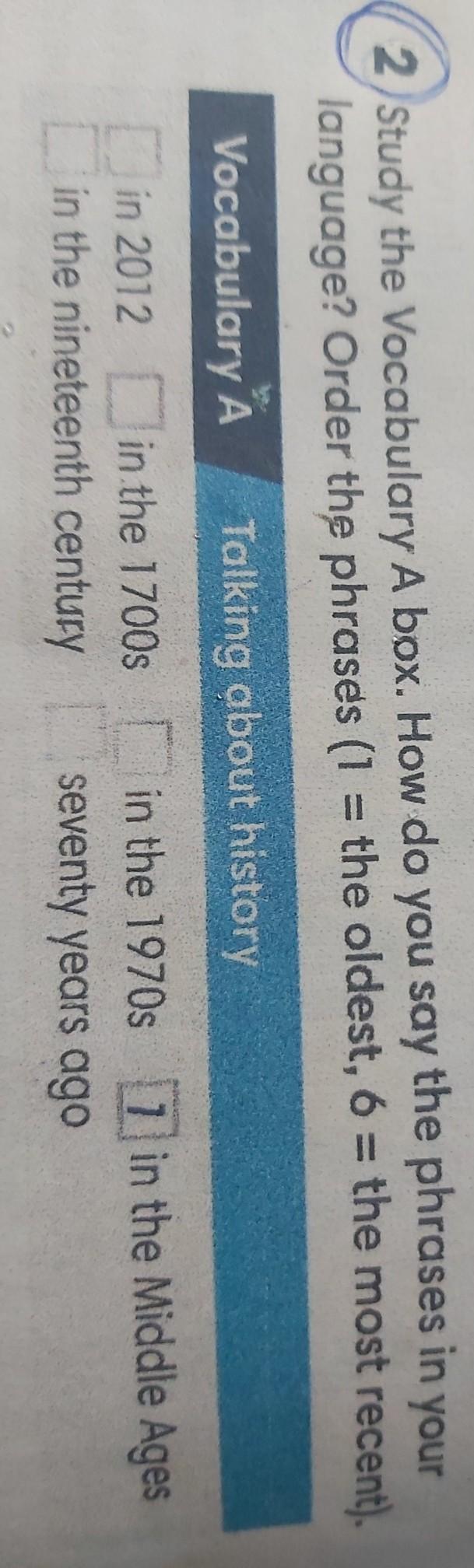 2)Study the Vocabulary A box. How do you say the phrases in your language? Order the phrases (1 = the oldest, 6 = the most recent). Vocabulary A Talking about history in 2012 in the 1700s in the nineteenth century in the 1970s in the Middle Ages seventy years ago