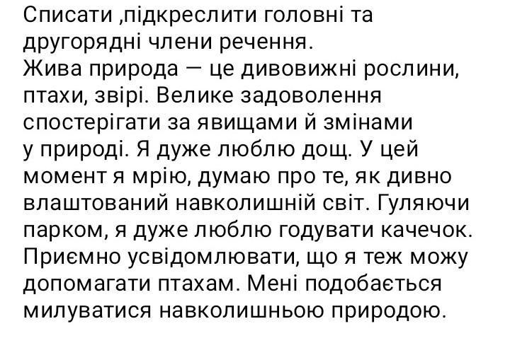 Списати ,підкреслити головні та другорядні члени речення. Жива природа це дивовижні рослини, птахи, звірі. Велике задоволення спостерігати за явищами й змінами у природі. Я дуже люблю дощ. У цей момент я мрію, думаю про те, як дивно влаштований навколишній світ. Гуляючи парком, я дуже люблю годувати качечок. Приємно усвідомлювати, що я теж можу допомагати птахам. Мені подобається милуватися навколишньою природою. -