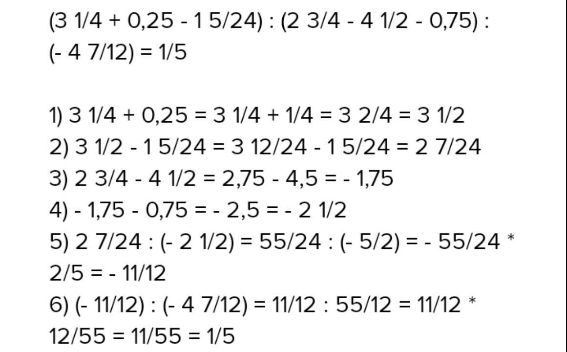 1) (3 1/4 + 0, 25 - 1 5/24) : (2 3/4 - 4 1/2 + 0, 75) : (- 4 7/12)
